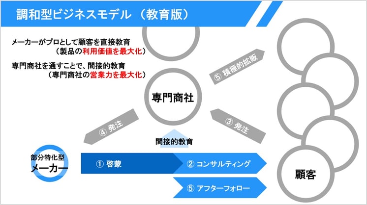 部分特化型メーカーであるA社と、専門商社と、顧客。すべてのステークホルダーが Win Win Win になる調和型ビジネスモデル(教育版)。みなさんの業界でも活かせるのではないでしょうか?