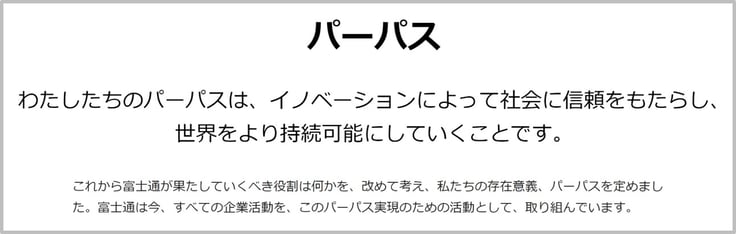 このパーパスを見たとき最初に頭に浮かんだことは「富士通らしさは?これって日立でもNECでも、なんならどの会社でも使えるなぁ...」です。当たり前のことすぎて、これをもとに「何をやるか、やらないか」の判断はできない。社員もこのパーパスを見て「よっしゃ!やるぞ!」という気持ちにはならないはず。これではパーパスを立てた意味がありません。