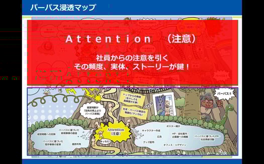 まず最初に「社員からの注意を引く」ことが必要です。そのために経営陣は戦略・事業を「パーパスに基づいて徹底的に変えていく」。さらに「進捗を共有する」ことが欠かせません。「少しずつでも進んでいる」ことがわかると、社員は「会社はパーパスに本気だ!」と認識します。